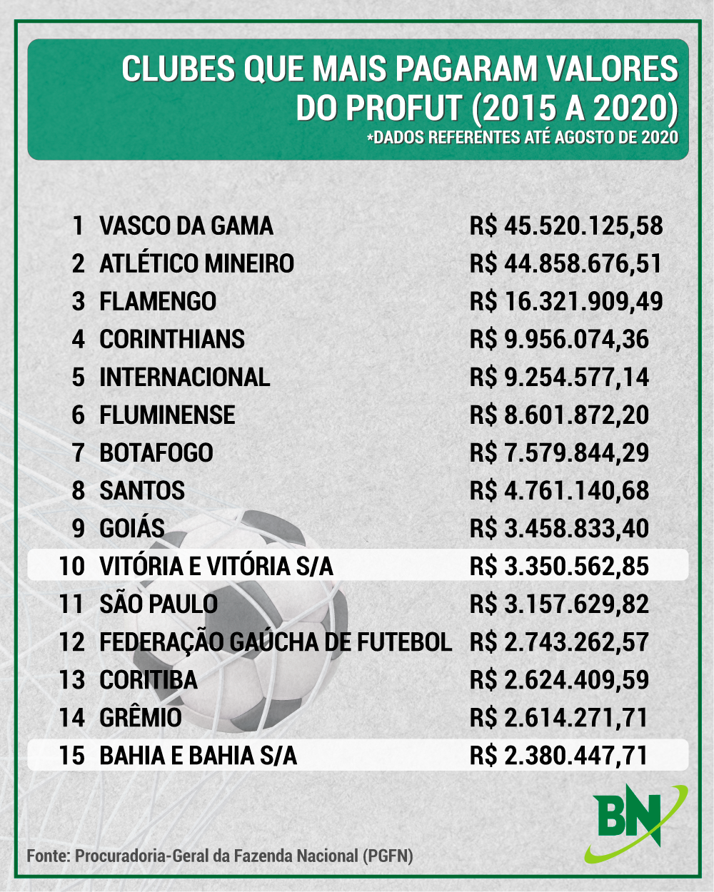 O Vitória tem nove parcelas em atraso com o Programa de Modernização da Gestão e de Responsabilidade Fiscal do Futebol Brasileiro (Profut), de acordo com dados obtidos pelo Bahia Notícias via Lei de Acesso à Informação junto à Procuradoria-Geral da Fazenda Nacional (PGFN). Os débitos, todos referentes ao CNPJ do Vitória S/A, colocam o clube como o nono na lista das agremiações com as maiores dívidas consolidadas: R$ 22.385.439,47. Por outro lado, é o décimo que mais saldou: R$ 3.350.562,85. Confira aqui o balanço do Esporte Clube Bahia .