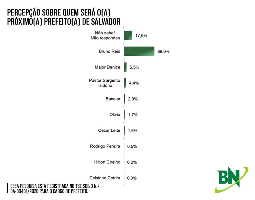 Registrada no Tribunal Superior Eleitoral (TSE) sob o número BA- 00401/2020, a pesquisa possui grau de confiança de 95% e margem de erro estimada em 3,5% para os resultados gerais.