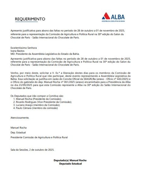 Uma comitiva de quatro deputados estaduais está se mobilizando para participar de uma feira internacional de chocolate, em Paris, no final deste mês de outubro, representando a Comissão de Agricultura e Política Rural da Assembleia Legislativa da Bahia (AL-BA). Um requerimento, assinado pelo presidente do colegiado, Manuel Rocha (União), foi protocolado na AL-BA solicitando abono pelas faltas dos parlamentares entre os dias 28 de outubro e 1º de novembro.